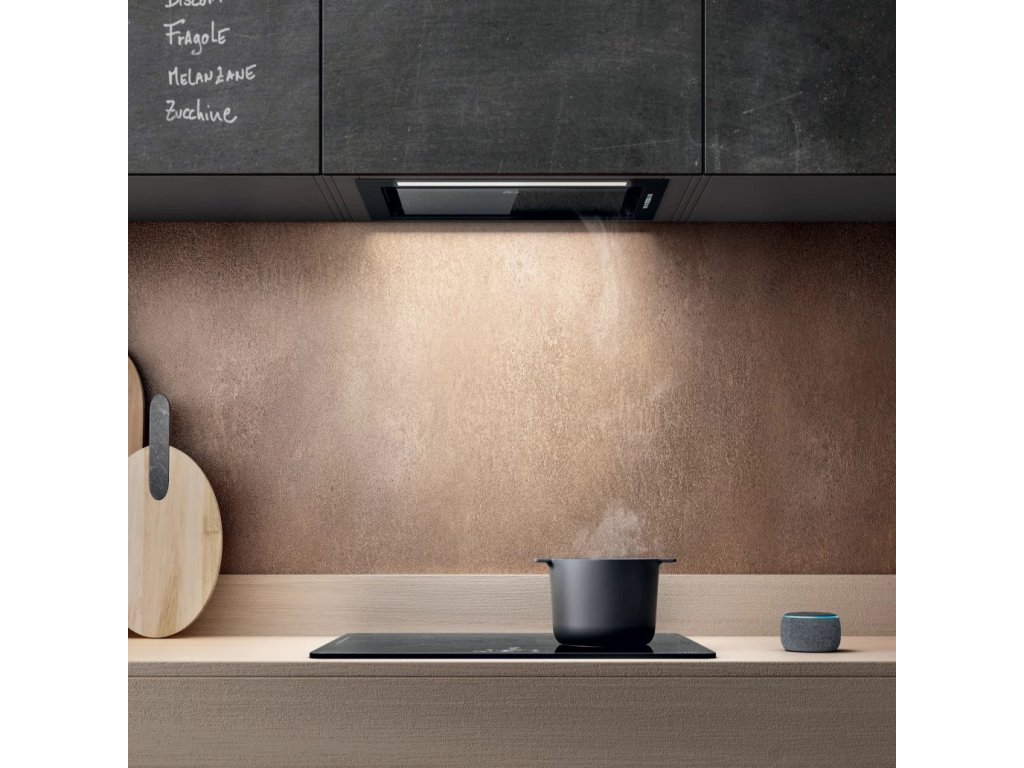 HIDDEN ADV PLUS @ je vybaven Wi-Fi konektivitou, která vám umožní digestoř zapnout, upravit její nastavení nebo vypnout na dálku prostřednictvím aplikace Elica nebo hlasového asistenta. Dále je vybavena technologií Bluetooth pro synchronizaci s indukční varnou deskou Elica, díky které se automaticky přizpůsobí právě používaným varným zónám.
