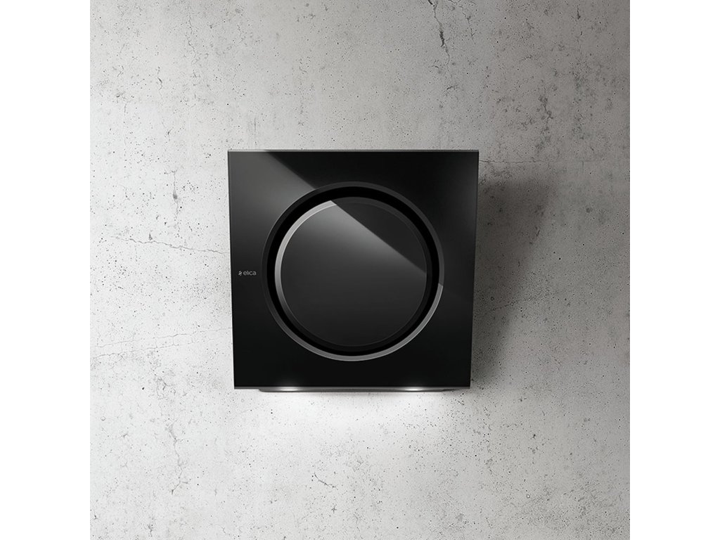 ELICA MINI OM elegantní odsavač par (digestoř) z černého skla a designového spojení kruhu a čtverce.